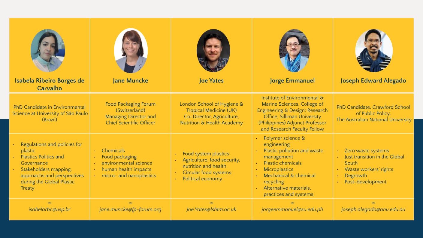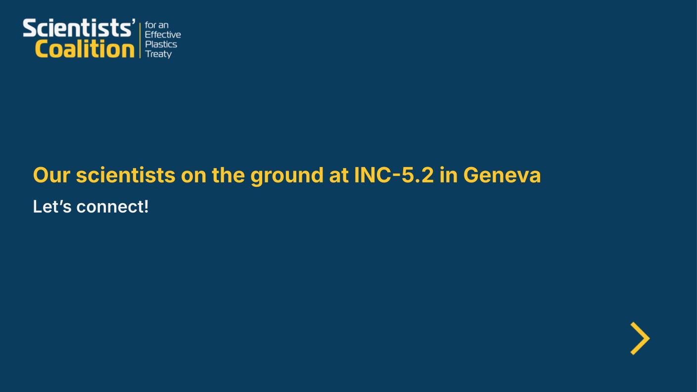 Our scientists are available before, during, and after the INC meeting to answer questions as well as to share and discuss the scientific evidence with INC delegates, ministers, ambassadors, and the media. To arrange a confidential meeting under Chatham House rules, please speak with a member of our Coalition in Geneva or contact the Coalition’s secretariat via email (scientists.coalition@ikhapp.org) or Signal/WhatsApp (+64 20 452 4556).